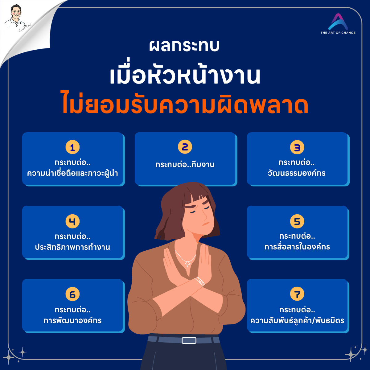 การไม่ยอมรับความผิดพลาดของหัวหน้างานสร้างผลกระทบที่ร้ายแรงและยาวนาน ทั้งต่อตัวหัวหน้าเอง ทีมงาน และองค์กรโดยรวม การแก้ไขสถานการณ์ต้องเริ่มจากการปรับเปลี่ยนมุมมองที่มีต่อความผิดพลาดจากสิ่งที่ต้องปกปิดเป็นโอกาสในการเรียนรู้และพัฒนา