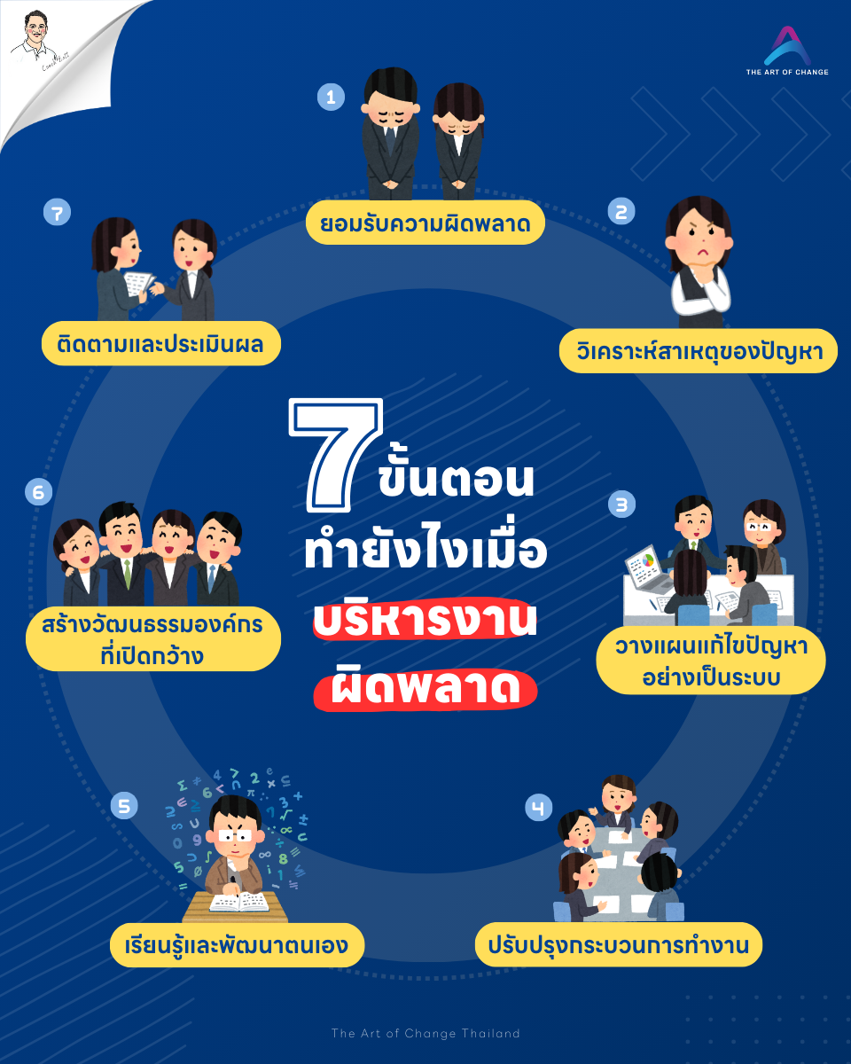 ในการบริหารงาน ไม่ว่าจะเป็นองค์กรขนาดใดก็ตาม ความผิดพลาดและความล้มเหลวเป็นสิ่งที่อาจเกิดขึ้นได้เสมอ แต่สิ่งสำคัญไม่ใช่ตัวความผิดพลาด หากแต่เป็นวิธีการรับมือและจัดการกับมัน ต่อไปนี้คือแนวทางการจัดการเมื่อเกิดความผิดพลาดในการบริหารงาน