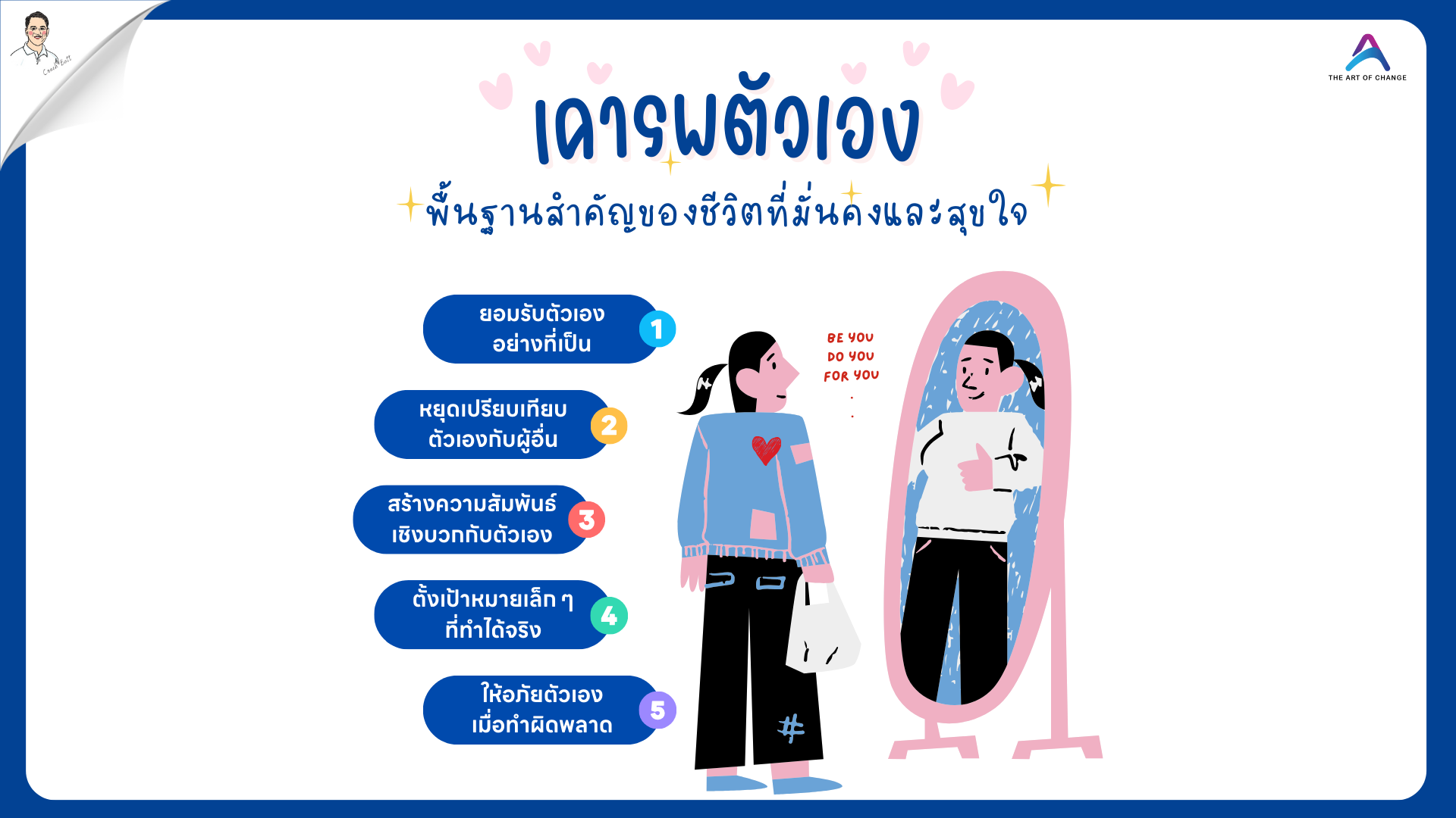 การเคารพตัวเอง คือ การให้คุณค่ากับตัวเราเองในแบบที่เราเป็น ไม่ใช่สิ่งที่ต้องรอให้ใครมายืนยัน แต่เป็นสิ่งที่เราสร้างได้ด้วยตัวเอง