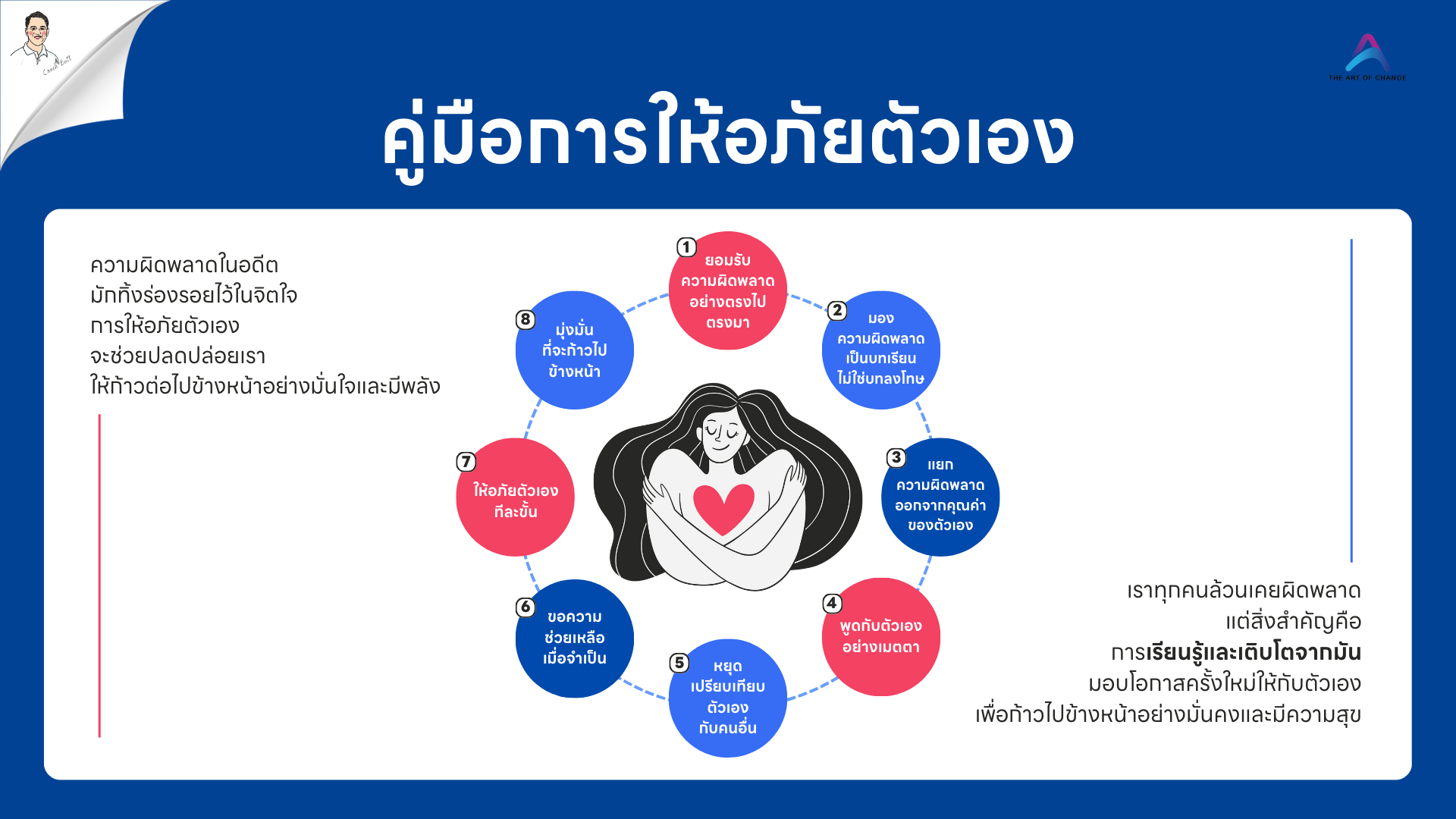 แต่สิ่งสำคัญคือการเรียนรู้และเติบโตจากมัน การให้อภัยตัวเองคือการมอบโอกาสครั้งใหม่ให้กับตัวเองเพื่อก้าวไปข้างหน้าอย่างมั่นคงและมีความสุขในปัจจุบันและอนาคต