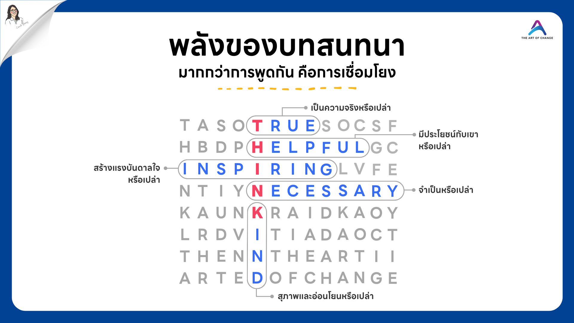 หนึ่งในแนวทางที่ง่ายและทรงพลังสำหรับการปรับปรุงการพูดคุยให้มีคุณภาพคือการใช้หลัก T-H-I-N-K ซึ่งเป็นสูตรจากบทความ Before You Speak, Think ใน Personal Excellence โดยสูตรนี้ให้แนวทางที่เป็นประโยชน์ในการออกแบบบทสนทนาที่มีคุณภาพ โดยก่อนที่เราจะพูดอะไรออกไป เราควรถามตัวเองด้วยคำถาม 5 ข้อที่ช่วยตรวจสอบและปรับปรุงการสื่อสารของเราให้ดียิ่งขึ้น