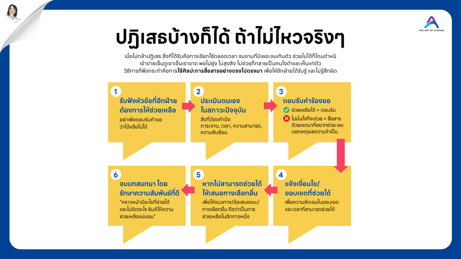 ถ้าประเมินแล้วสามารถช่วยเหลือได้ ก็รับปากช่วยได้ หากประเมินแล้วไม่มั่นใจพอ ให้ใช้การสื่อสารด้วยเจตนาอยากช่วยก่อน เพื่อให้อีกฝ่ายรู้สึกไม่ถูกปฏิเสธ จากนั้น ให้บอกเหตุผลและความจำเป็น ว่ามีภาระงานใดที่ต้องรับผิดชอบหรือค้างอยู่ พร้อมระยะเวลา เช่น อยากช่วยนะ แต่ตอนนี้มีงานที่ต้องอยู่ ซึ่งจะเสร็จวันศุกร์นี้