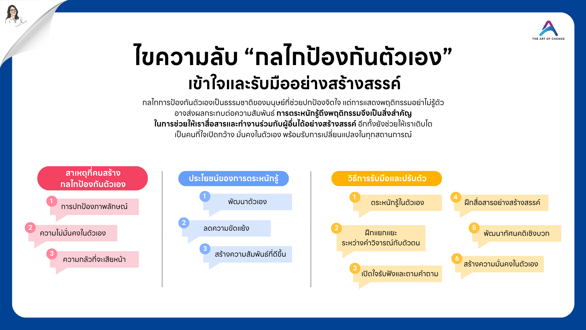 กลไกการป้องกันตัวเองเป็นธรรมชาติของมนุษย์ที่ช่วยปกป้องจิตใจ แต่การแสดงพฤติกรรมนี้อย่างไม่รู้ตัว อาจส่งผลกระทบต่อความสัมพันธ์และการพัฒนาตนเอง การตระหนักรู้และเข้าใจว่าทำไมเราถึงมีพฤติกรรมแบบนี้ ช่วยให้เราสื่อสารและทำงานร่วมกับผู้อื่นได้อย่างสร้างสรรค์ และที่สำคัญคือช่วยให้เราเติบโตเป็นคนที่เปิดใจกว้าง มั่นคงในตัวเอง และพร้อมรับความเปลี่ยนแปลงในทุกสถานการณ์