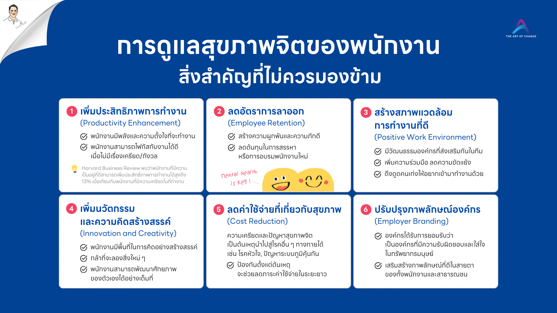 Harvard Business Review ระบุว่า 'องค์กรที่ลงทุนในการสนับสนุนสุขภาพจิตและความเป็นอยู่ของพนักงาน ไม่เพียงช่วยลดอัตราการลาออกแต่ยังช่วยเพิ่มประสิทธิภาพการทำงาน และความพึงพอใจของพนักงานในระยะยาว'